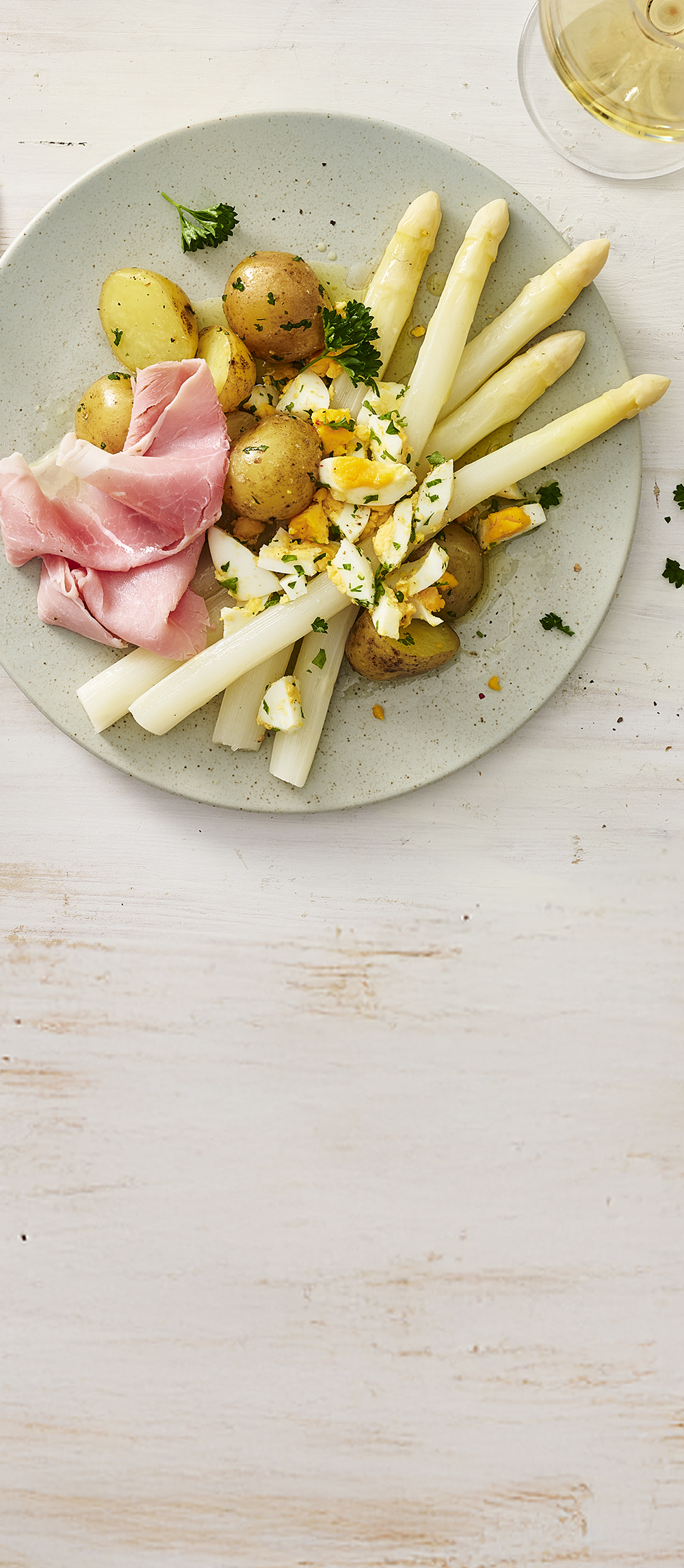 Was en scrub de aardappelen. Halveer de grootste aardappelen. Schil de asperges en snijd in stukjes van 3 cm. Kook de aardappelen en asperges apart gaar (aardappelen kunnen ook in de stoomoven of magnetron).