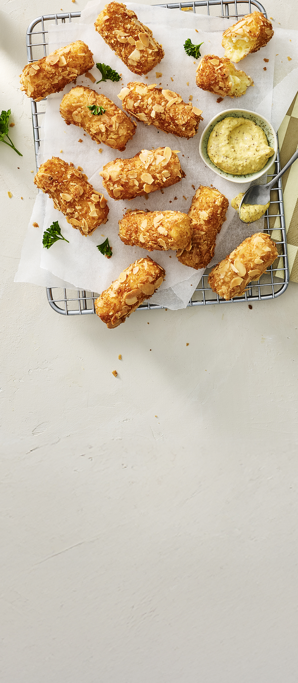 Klop het resterende ei los met een scheutje melk. Zet drie kommetjes klaar: met panko, ei en amandelschaafsel. Paneer de kroketjes: haal ze achtereenvolgens door de panko, het ei en het amandelschaafsel. Verhit 2 cm olie in een wok. Test met een stukje brood of de olie heet genoeg is; het brood kleurt dan bruin. Frituur de kroketjes in twee rondes in ca. 4 minuten goudbruin.