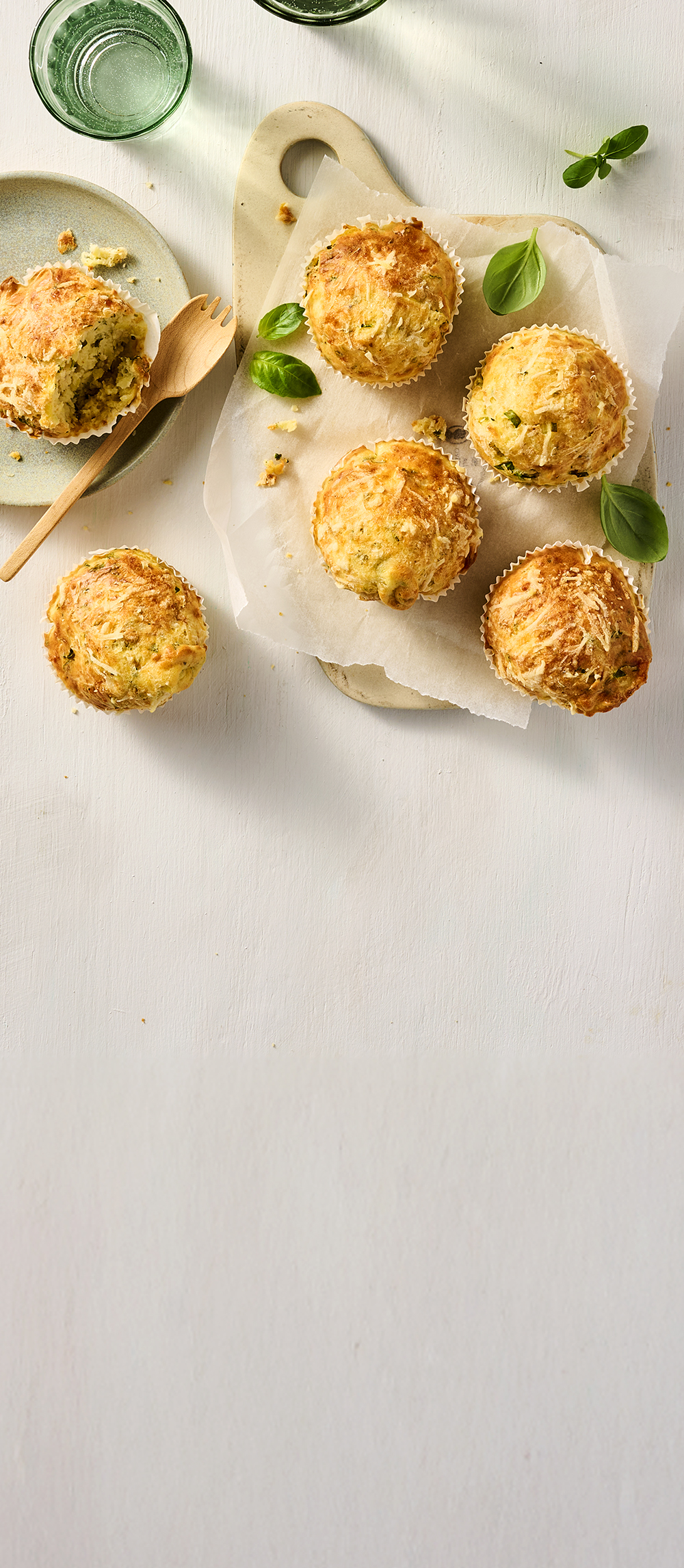 Vet de holtes van de vorm in met olie of leg er papieren muffin vormpjes in. Verdeel het beslag erover en bestrooi met Parmezaanse kaas (of pecorino). Bak de muffins in ongeveer 25 minuten goudbruin en gaar in de oven. Zijn de muffins na 20 min. bovenop nog niet bruin genoeg, schakel de ovenstand dan naar hete lucht met extra bovenwarmte. Houd ze wel in de gaten, het bruin worden kan snel gaan. Neem de vorm uit de oven, laat 10 min. staan en los de muffins. Je kunt ze warm, lauwwarm of koud eten.