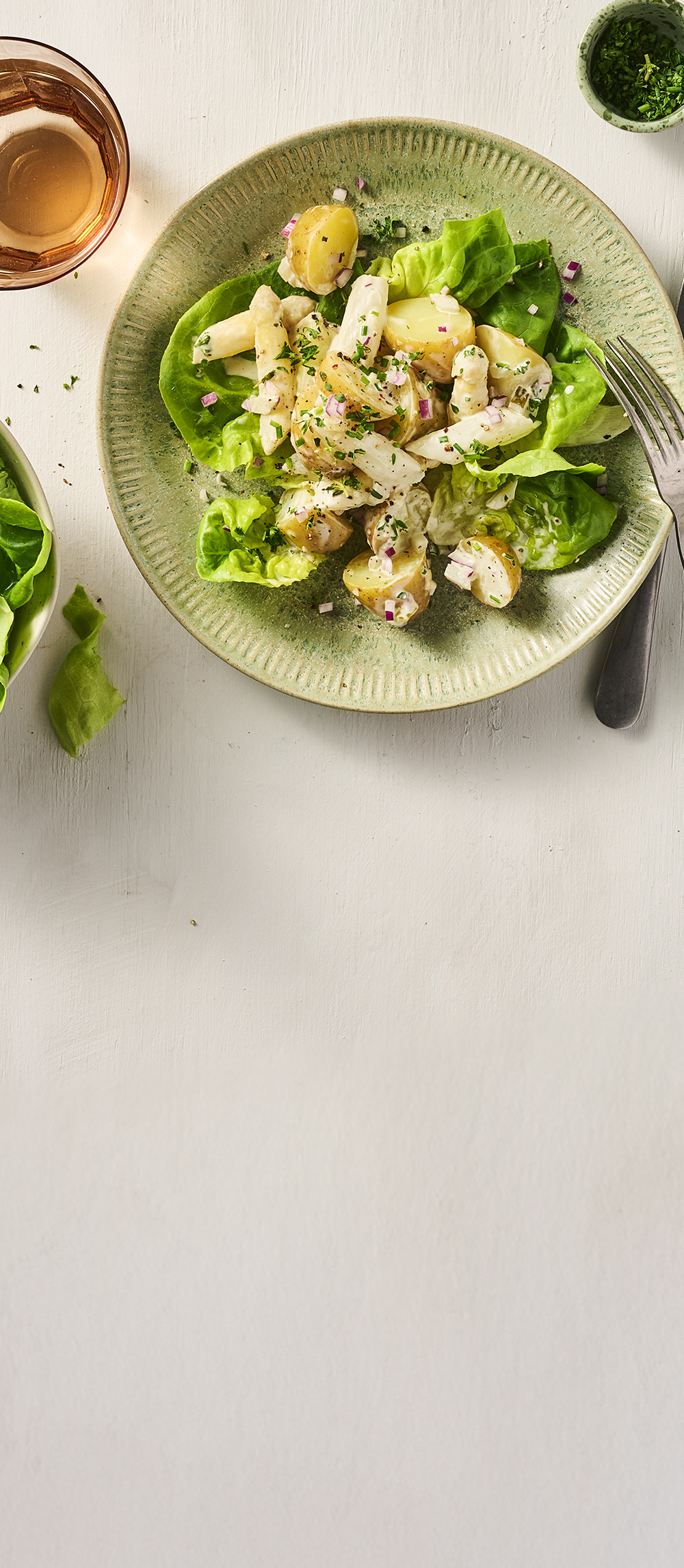 Giet de aardappelen en asperges af en spoel ze koud. Laat goed uitlekken. Meng met 4-5 el kruidenmayonaise en breng op smaak met zout en peper. Verdeel de sla over een schaal en schep de salade erop.