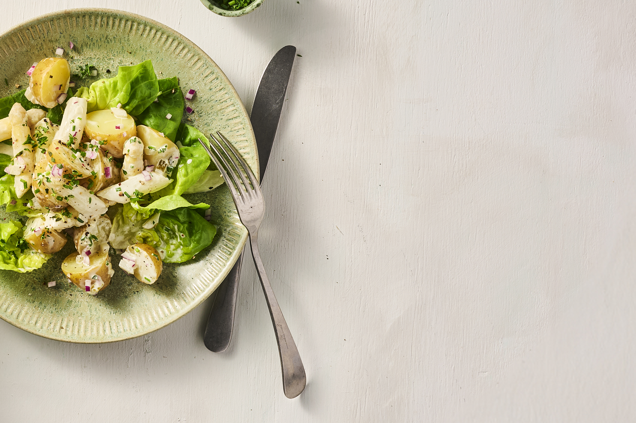 Giet de aardappelen en asperges af en spoel ze koud. Laat goed uitlekken. Meng met 4-5 el kruidenmayonaise en breng op smaak met zout en peper. Verdeel de sla over een schaal en schep de salade erop.