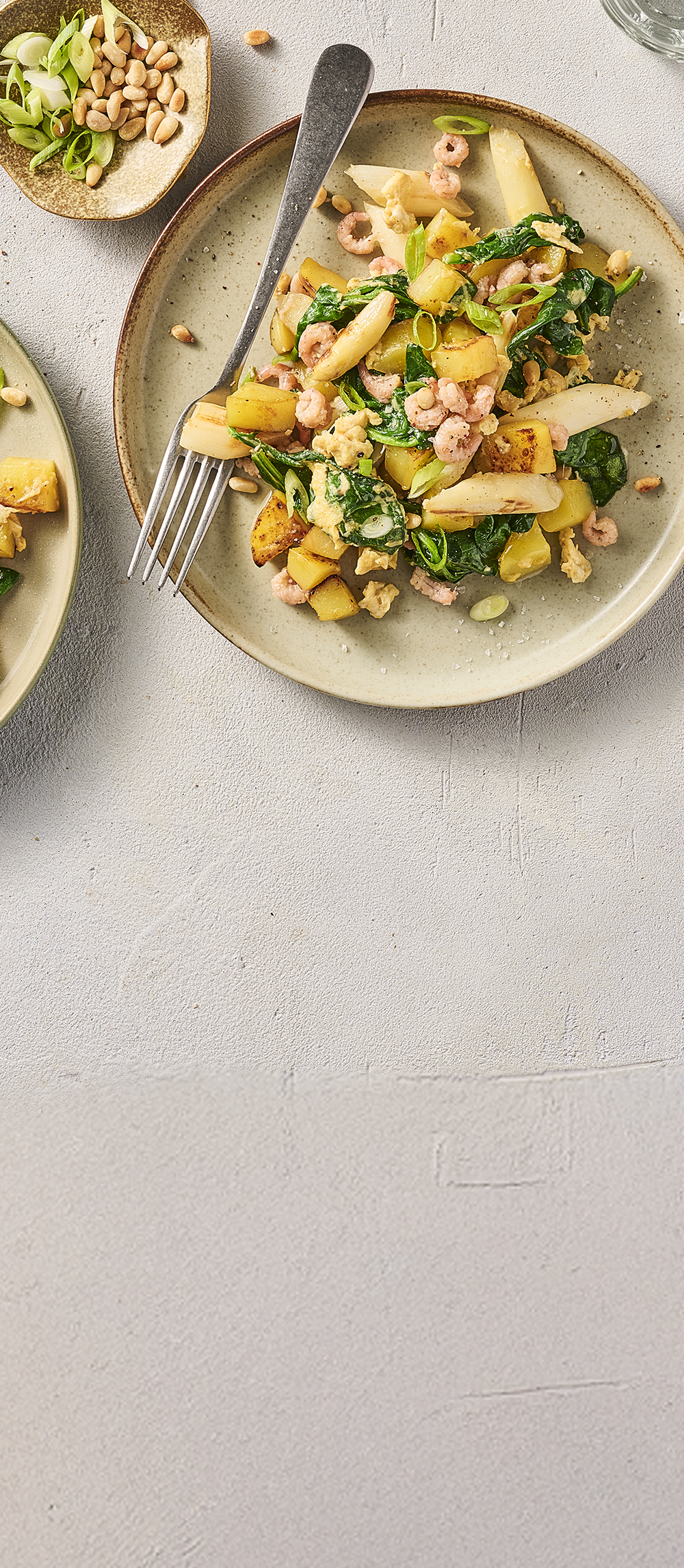 Verhit de olie in een wok en bak de aardappelblokjes en asperges beetgaar.