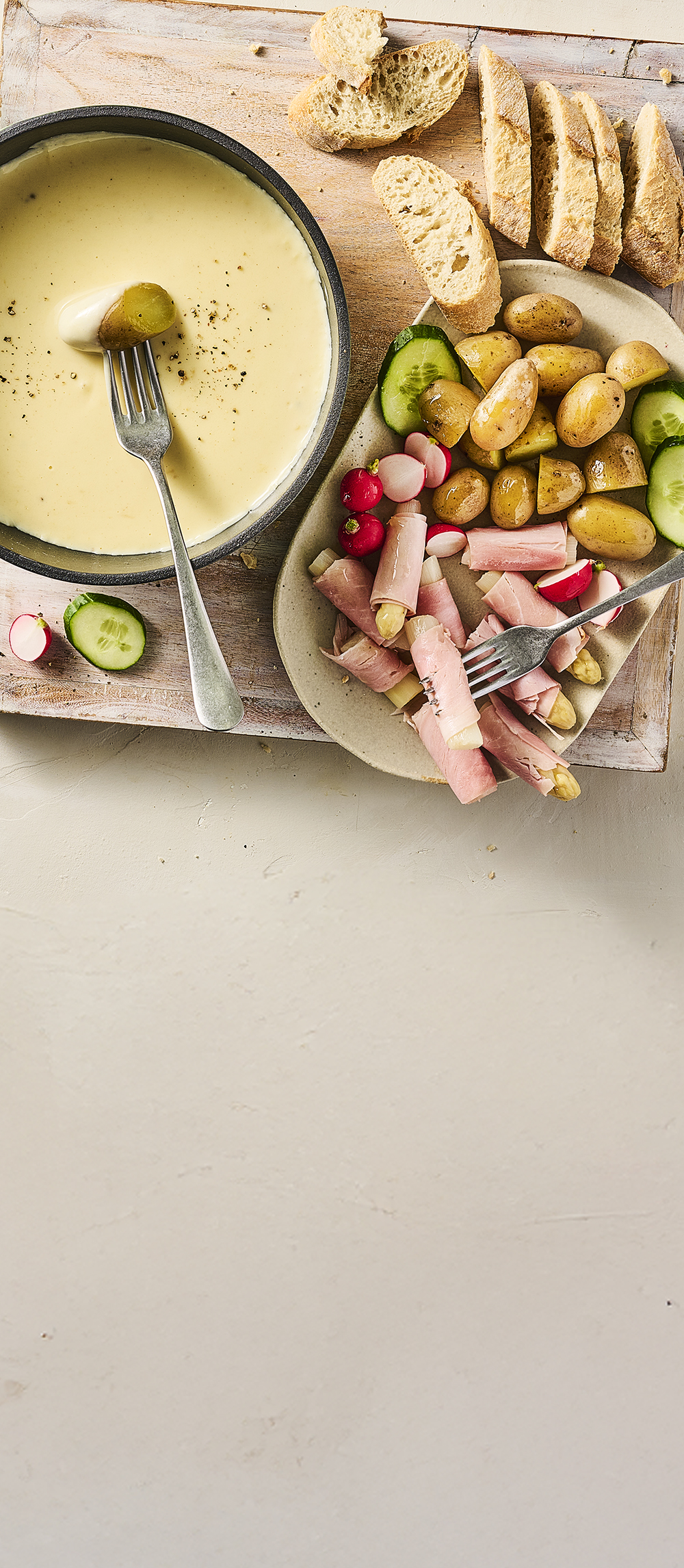 Serveer de fondue direct in een fonduepan of in een vuurvaste schaal op een rechaud. Dip de aspergerolletjes, aardappels, radijsjes, komkommer en stokbrood in de saus.