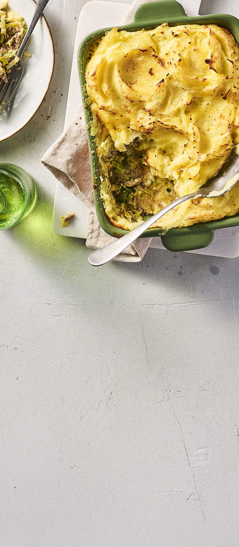 Schep de aardappelpuree in een ovenschaal, bedek met het preimengsel en bestrooi met de resterende Parmezaanse kaas. Bak 15-20 minuten in de oven.