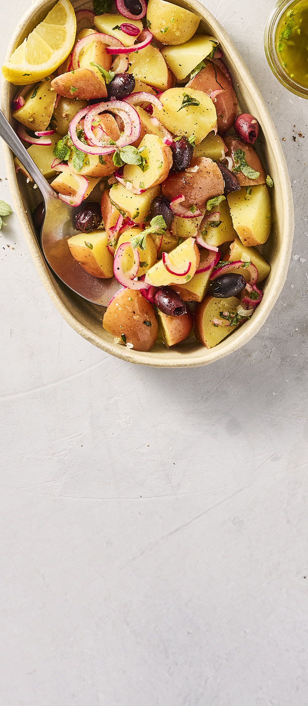 Scrub de aardappels schoon, halveer ze en kook in water met een snufje zout gaar. Snijd de rode ui in dunne ringen, meng ze met azijn en laat 5 minuten intrekken. Hak de majoraan fijn en pers de knoflook uit.