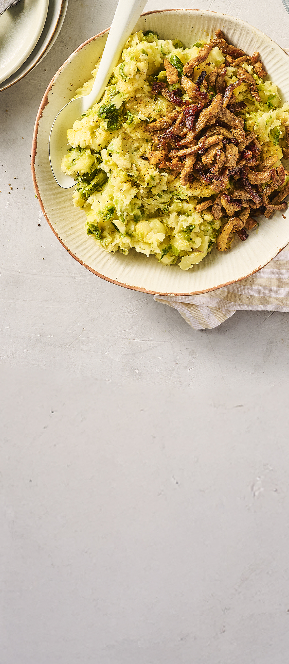 Giet de aardappelen en spruitjes af en stamp ze grof. Breng op smaak met peper en zout.